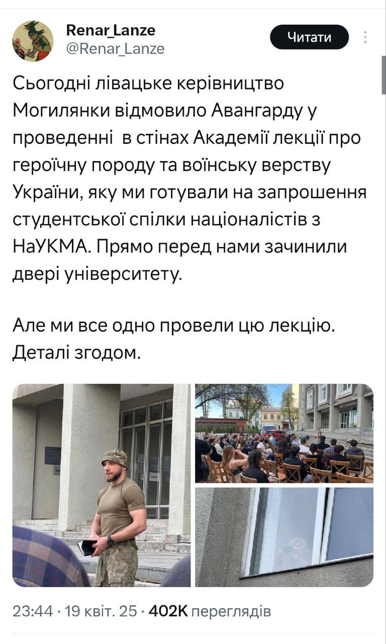 "Сюрреализм четвертого года полномасштабной войны. Под стенами помещения с пафосной табличкой "Культурно-художественный центр НаУКМА" собралось студенчество Киево-Могилянской академии. Именно той Могилянки, которая с 1632 года была средоточием украинства и несла правильные смыслы там, где их не было. Но сегодня студенты стоят у стен, а не внутри. Потому что двери для них закрыты. Руководство академии – в лицах Сергея Квита, Дмитрия Мазина и Владиславы Осьмак – запретило лекцию украинского военного, который прошел от самых горячих участков фронта, Евгения Врядника, друга Жекуса. Ему отказали из-за вывода так называемого "комитета по этике" – мол, он слишком правый, чтобы читать в академии лекции. Тема лекции: "Героическая порода: от старой Украины до Третьих освободительных движений", – написал Кухарчук в Фейсбуке.