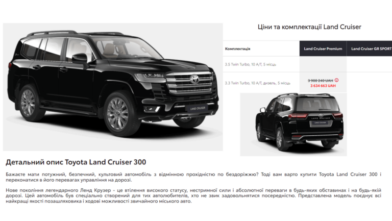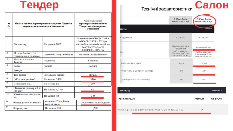 "Наші Гроші" сравнили технические характеристики автомобиля с тем, что продают в салонах и определили ближайшую к тендерной модель - это Toyota Land Cruiser 300 с 3.3 Twin Turbo двигателем и ценой около 3,6 - 3,9 млн грн.