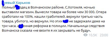 "В Волчанском районе, с.Хотомля, ночью выставили магазин. Вынесли товара на более чем 30 000. Опера сработали на 100%, нашли грабителей, вернули третью часть товара, убитого, но вернули. Но этих *ук не задержали даже на три часа, а*уенная реформа в полиции. Начальница следствия Волчанска сказала "не везите я их закрывать не буду", - говорится в сообщении.