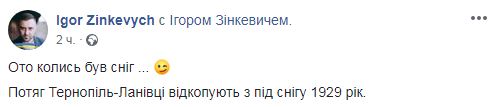 "Вот это когда-то был снег... Поезд Тернополь-Лановцы откапывают из-под снега 1929", - написал он.