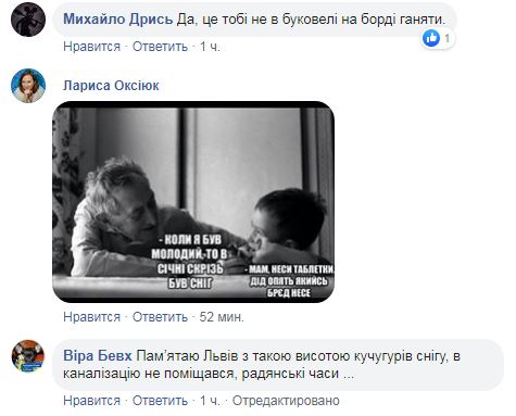 "Помню Львов с такой высотой сугробов снега, в канализацию не помещался, советские времена", "Да, это тебе не в Буковеле на борде гонять", - пишут в комментариях.