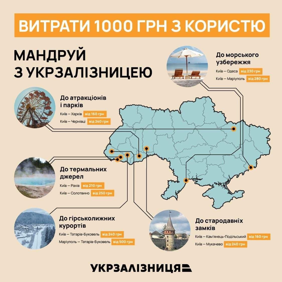 Так, на странице компании представили инфографику, на которой изображены интересные места Украины и указана стоимость железнодорожных билетов из города отправления в города, где они находятся.