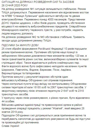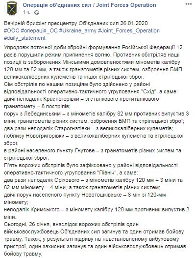 В воскресенье, 26 января, в результате вражеских обстрелов один военнослужащий Объединенных сил погиб и один получил боевую травму.