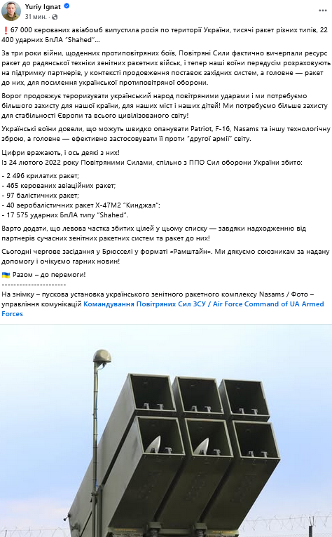 "Теперь наши воины, прежде всего, рассчитывают на поддержку партнеров, в контексте продолжения поставок западных систем, а главное - ракет к ним, для усиления украинской противовоздушной обороны. Враг продолжает терроризировать украинский народ воздушными ударами и мы нуждаемся в большей защите для нашей страны, для наших городов и наших детей! Мы нуждаемся в большей защите для стабильности Европы и всего цивилизованного мира!", - сообщил Игнат.