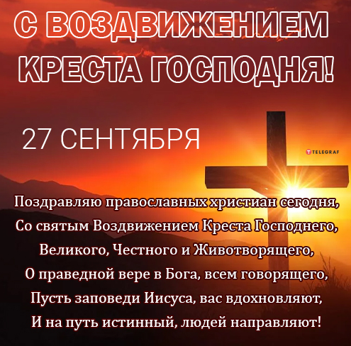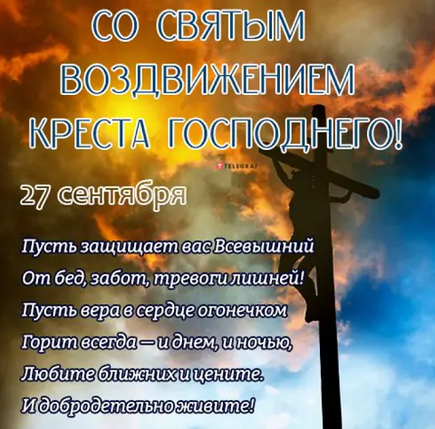 Пускай в этот праздничный день возликует ваша душа. Пускай ваши сердца наполнятся светом, добром и счастьем. Желаю, чтобы крепкая вера помогала вам в жизни, берегла от бед, неудач и разочарования. Поздравляю с воздвижением Честного и Животворящего Креста Господня!