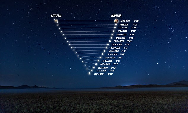 21 декабря Юпитер и Сатурн в соединении можно будет увидеть примерно через час после захода солнца. Чтобы детально увидеть конвергенцию планет, которая фактически отдаляет планеты на расстоянии 500 миллионов миль друг от друга, могут понадобиться телескопы, но свет должен быть виден и невооруженным глазом.