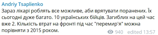 "Сейчас врачи делают все возможное, чтобы спасти раненых. Их сегодня очень много. 10 украинских бойцов. Погибших в настоящее время уже 2. Количество потерь на фронте во время "перемирия" можно сравнить с 2015 годом", - сообщил военный корреспондент Андрей Цаплиенко.