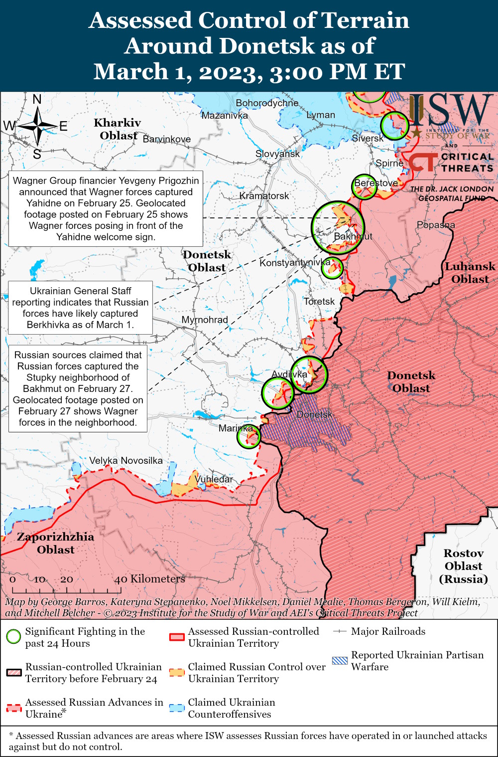 Российские источники утверждали, что боевики ЧВК "Вагнера" продвинулись в пределах Бахмута в районе мясокомбината. Оккупанты заявляют, что атакуют украинские позиции вдоль трассы Т0504 Константиновка-Часов Яр-Бахмут в районе Ивановского и что украинские войска отходят из Часового Яра. Украинские официальные лица заявляют, что ВСУ имеют возможность провести контролируемый вывод из Бахмута, если они сочтут это целесообразным.