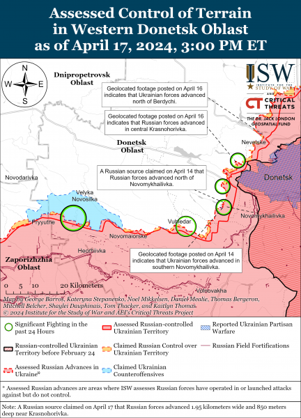 Российские войска недавно продвинулись к западу от Донецка и 17 апреля продолжили наступательные операции к западу и юго-западу от Донецка.