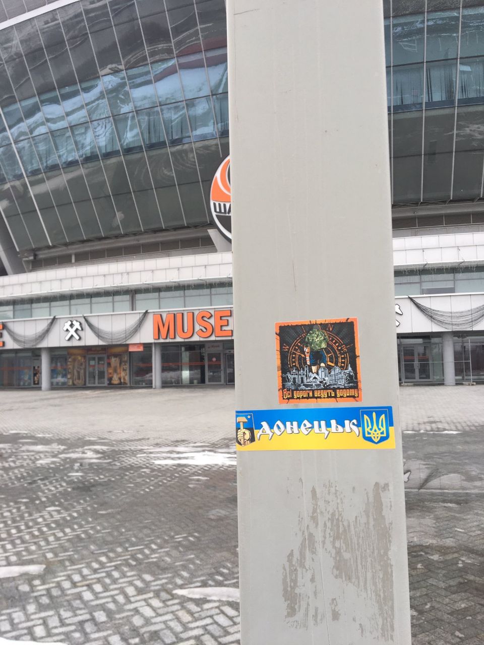 На снимке можно увидеть столб электропередач, на котором наклеен флаер в желто-голубом цвете с надписью: "Донецк".
