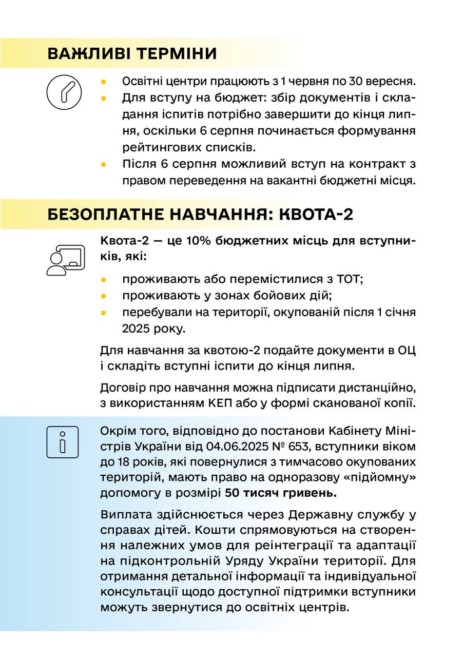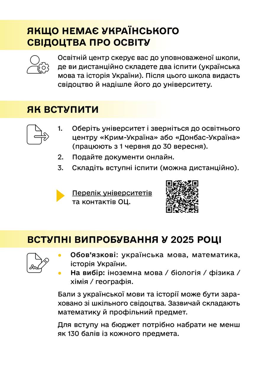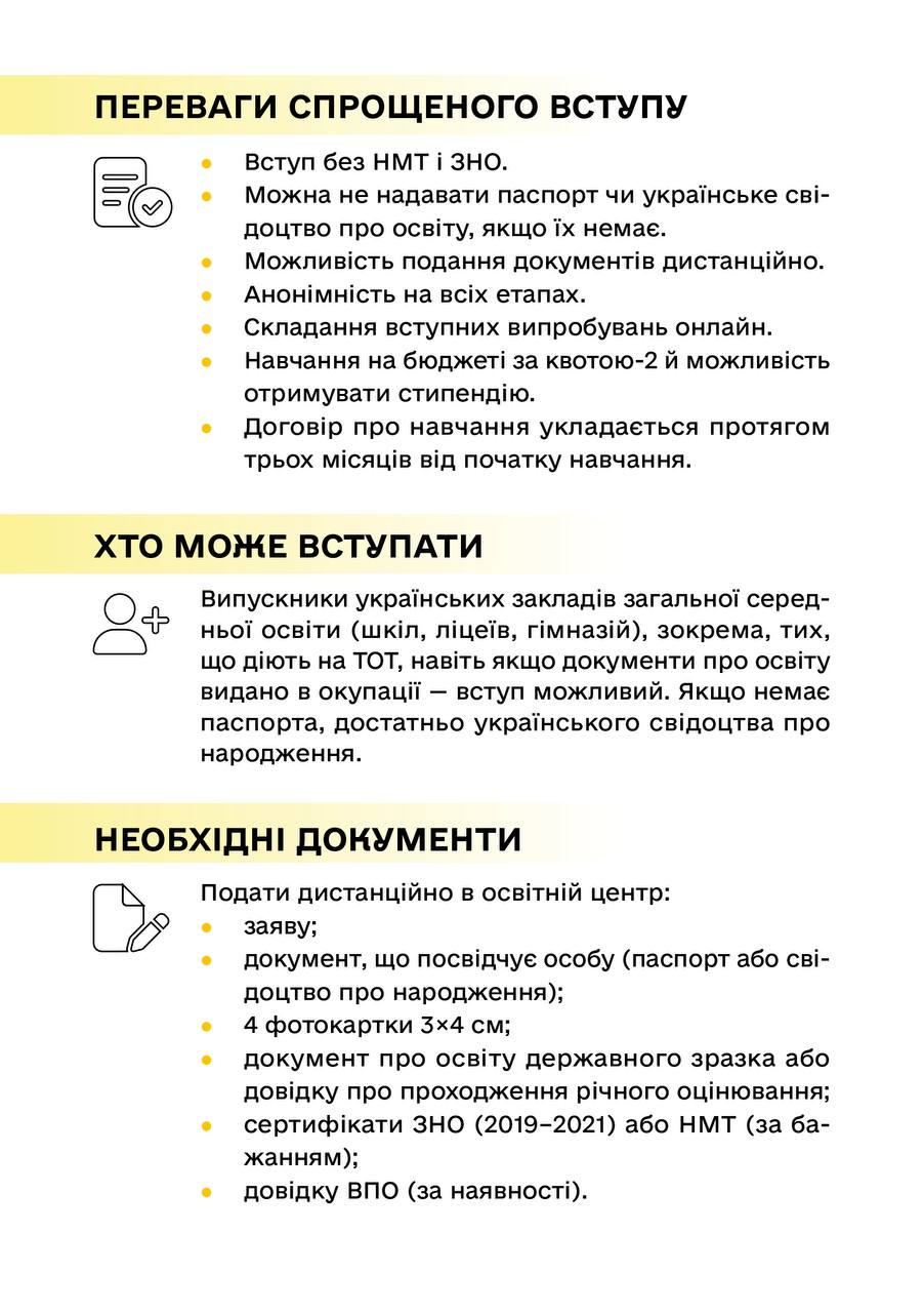 "Обучение в университете – важный шаг для каждого абитуриента. В 2025 году поступающие с временно оккупированных территорий и прифронтовых зон смогут поступать на бюджет по упрощенной процедуре. Она предусматривает возможность поступления без сдачи национального мультипредметного теста (НМТ)", – отметил он.