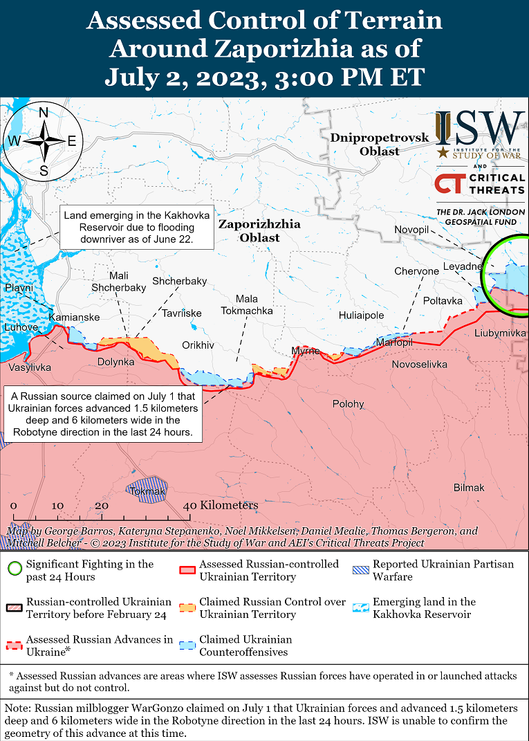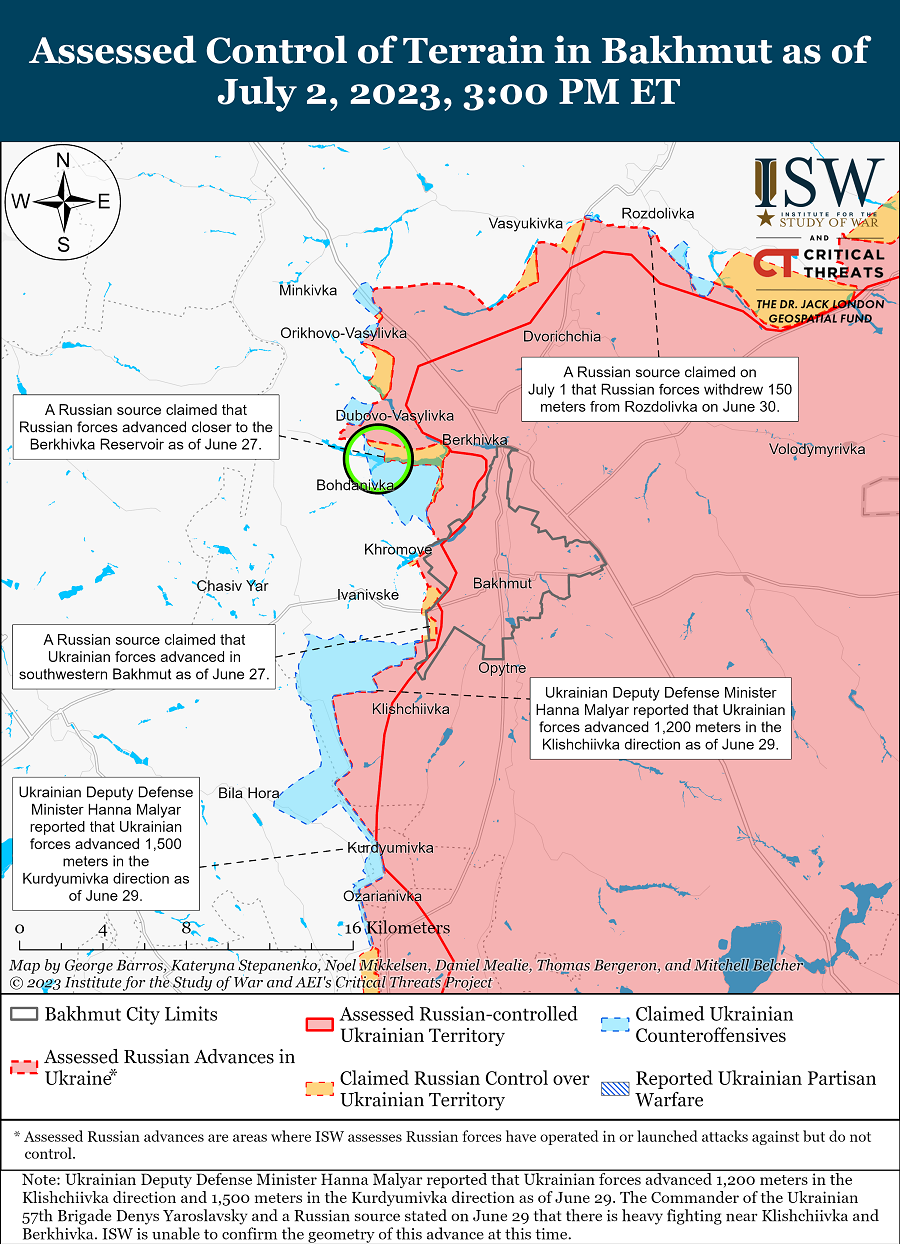 По словам аналитиков, министерство обороны России и другие российские источники утверждали, что украинские войска вели наступательные действия в Лиманском направлении, в районе Бахмута, на участке Авдеевка-Донецк, на западе Донецкой области, на административной границе между Запорожской и Донецкой областями и на западе Запорожской области. Спикер Восточной группировки войск Украины полковник Сергей Череватый 2 июля сообщил, что украинские войска продолжают наступать на флангах в районе Бахмута. Российский милблогер утверждал, что украинские силы добились неопределенных успехов к юго-западу от Клищиевки (7 км к юго-западу от Бахмута).