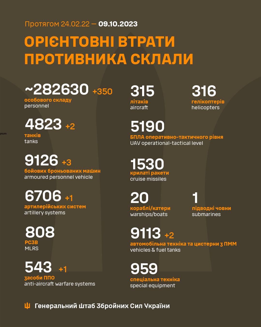 Общие боевые потери противника с 24.02.22 по 09.10.23 ориентировочно составили: