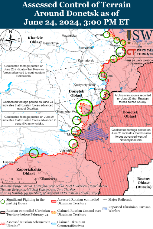 Специалисты добавляют, что российские войска продолжали вести наземные атаки на запад и юго-запад от Донецка 24 июня, но без изменений на фронте. Бои также продолжались к юго-западу от Донецка возле Георгиевки, Парасковиевки и Константиновки.