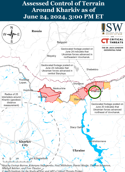 ВСУ контратаковали и восстановили некоторые тактические позиции к северо-востоку от Харькова. Была перестрелка на северо-востоке Волчанска (северо-восток от Харькова), что, как отмечают аналитики, свидетельствует о том, что украинские силы восстановили ограниченные позиции вдоль улицы Хлебороба.