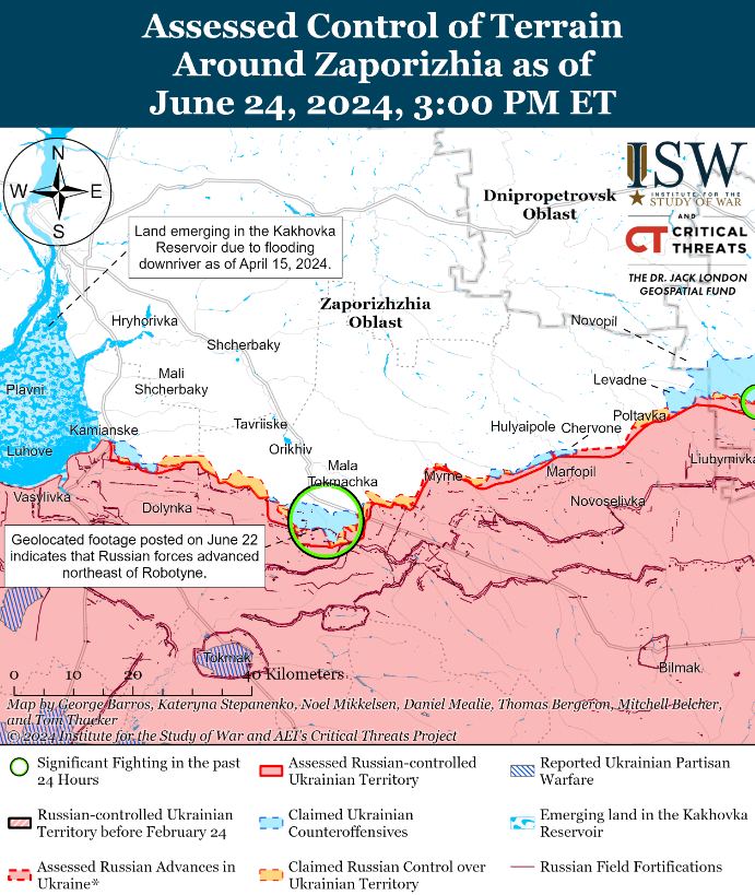 По сообщениям ISW, российские войска продолжали наступать вблизи Малой Токмачки (к северо-востоку от Роботино).