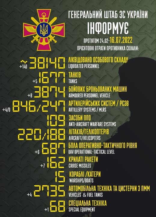 Общие боевые потери противника с 24.02 по 16.07 ориентировочно составили: