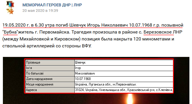 "Шевчук Игорь Николаевич "Бубна" (10/07/68, уроженец Первомайска, проживал в Хмельницкой обл.) погиб 19/05/20 в результате обстрела позиций 2ак роа в р-не н.п. Березовское", - сказано в сообщении блогера.