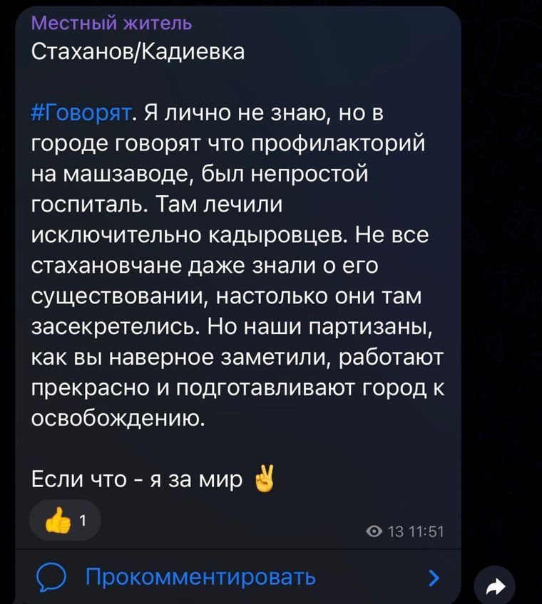 Позже появилась информация о том, что профилакторий машиностроительного завода в Кадиевке был не госпиталем для российских оккупантов, о чем сообщалось ранее, а местонахождением "кадыровцев".