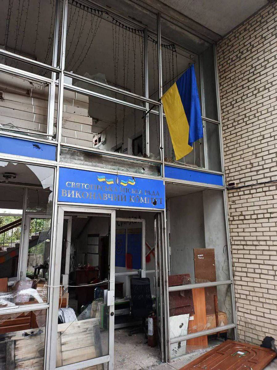 В частности, появилось фото с украинским флагом, развевавшимся над уничтоженным зданием городского совета Святогорска.