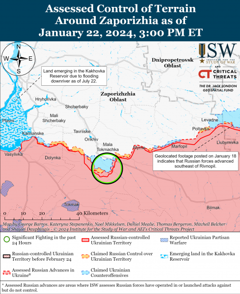 На 22 января украинские войска удерживают позиции на восточном (левом) берегу Херсонской области, но на этом участке линии фронта изменений не произошло. Позиционные боевые действия продолжались вблизи Кринок.