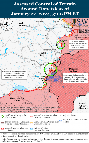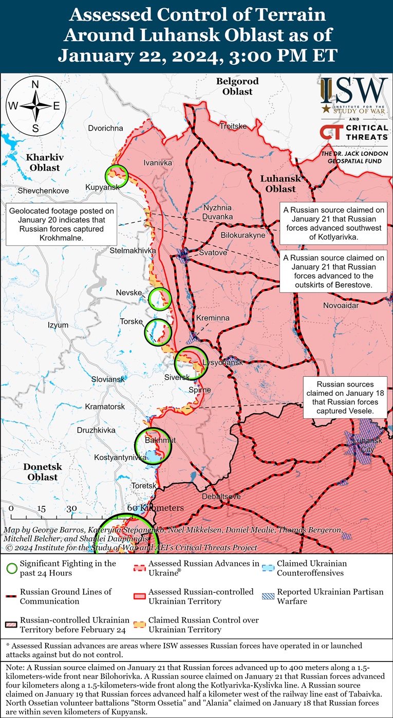 22 января российские войска продолжали усиленные наступательные операции к юго-востоку от Купянска. Несколько "военкоров" РФ утверждали, что российские силы якобы продвинулись юго-западнее Крахмального близ Берестового. Позиционные боевые действия продолжались северо-восточнее Купянска близ Синьковки и Петропавловки. Российские военные блоггеры сообщали о наземных атаках сил РФ вдоль линии Сватово-Кременной и об их продвижении на некоторых участках, в том числе в районе Белогоровки. Однако аналитики ISW не увидели визуального подтверждения этих заявлений россиян.
