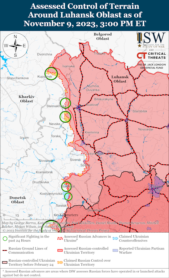 По информации ISW, украинские войска 9 ноября не проводили никаких заявленных или подтвержденных наземных атак в районе границы Донецкой и Запорожской областей, украинские войска отбили российские атаки вблизи Старомайорска и к югу от Пречистовки.