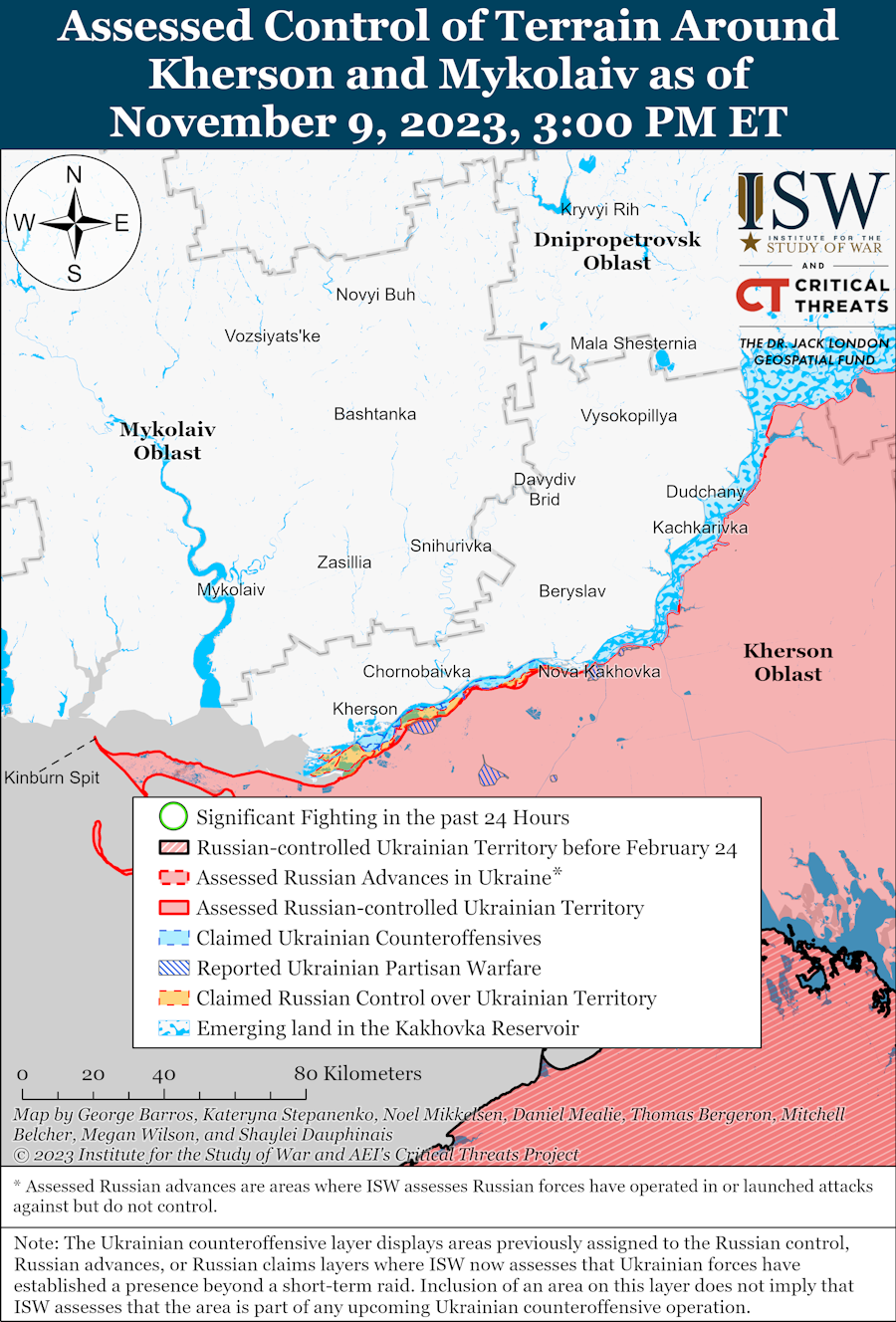 Как отмечают в ISW, украинские войска установили контроль над новыми позициями в Крынках и вели атаки в направлении российских позиций к югу и юго-западу от населенного пункта. Российские источники сообщают, что ВСУ также атаковали вблизи Поймы, Пищановки, Коварного и пытаются установить позиции между Коварным и Казачьими Лагерями.