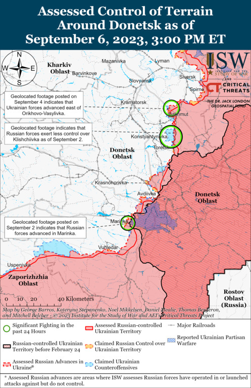 Генштаб сообщил, что ВСУ добились частичного успеха на Бахмутском направлении и вытеснили российских оккупантов с позиций к югу от Бахмута. Сырский сообщил, что наши войска постепенно отвоевывают позиции в этом районе. Украинский Генштаб также сообщил о том, что российские военные безуспешно атаковали вблизи Железнянского, Орехово-Василовки, Клещиевки и Белой Горы. Украинские силы вели наступательные операции по линии Авдеевка-Донецк. Геолокационные кадры показывают, что украинские силы продвинулись к востоку от Невельского.