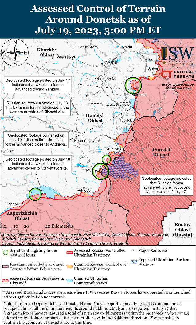 Украинские войска продолжали контрнаступательные действия на северном и южном флангах Бахмута и достигли ограниченных успехов 20 июля. Геолокационные кадры показывают, что украинские войска продвинулись в лесном районе Клещиевки (7 км юго-западнее Бахмута).
