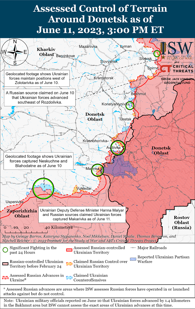 Так, аналитики пишут, что замминистра обороны Украины Анна Маляр заявила, что украинские войска продвинулись на юге Украины на 300-1500 метров. Маляр и другие украинские и российские источники сообщили, что украинские войска преуспели к югу от Великой Новоселки в период с 10 по 11 июня, освободив, в частности, Макаровку, Нескучное, Благодатное, Сторожево и Новодаровку.