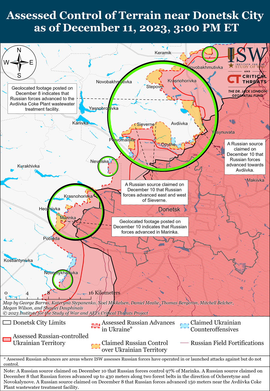 ISW обнаружил, что российские войска продолжили наступательные операции под Авдеевкой 11 декабря и недавно немного продвинулись.