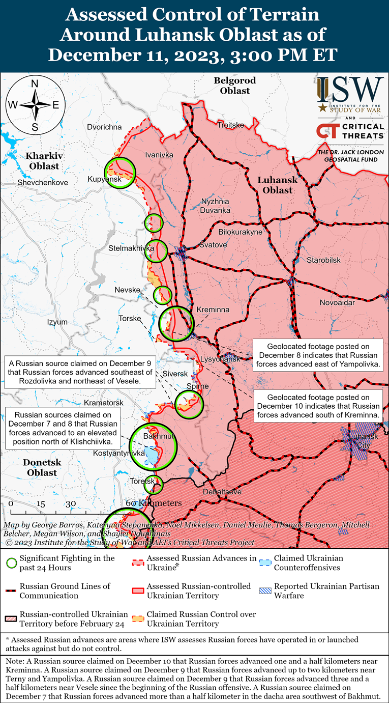 ISW пишет, что российские войска продолжили наступательные операции вдоль линии Купянск-Сватово-Кременная и немного продвинулись вперед 11 декабря. Видеозапись с геолокацией, опубликованная 10 декабря, показывает, что российские войска немного продвинулись к юго-востоку от Дибровы.