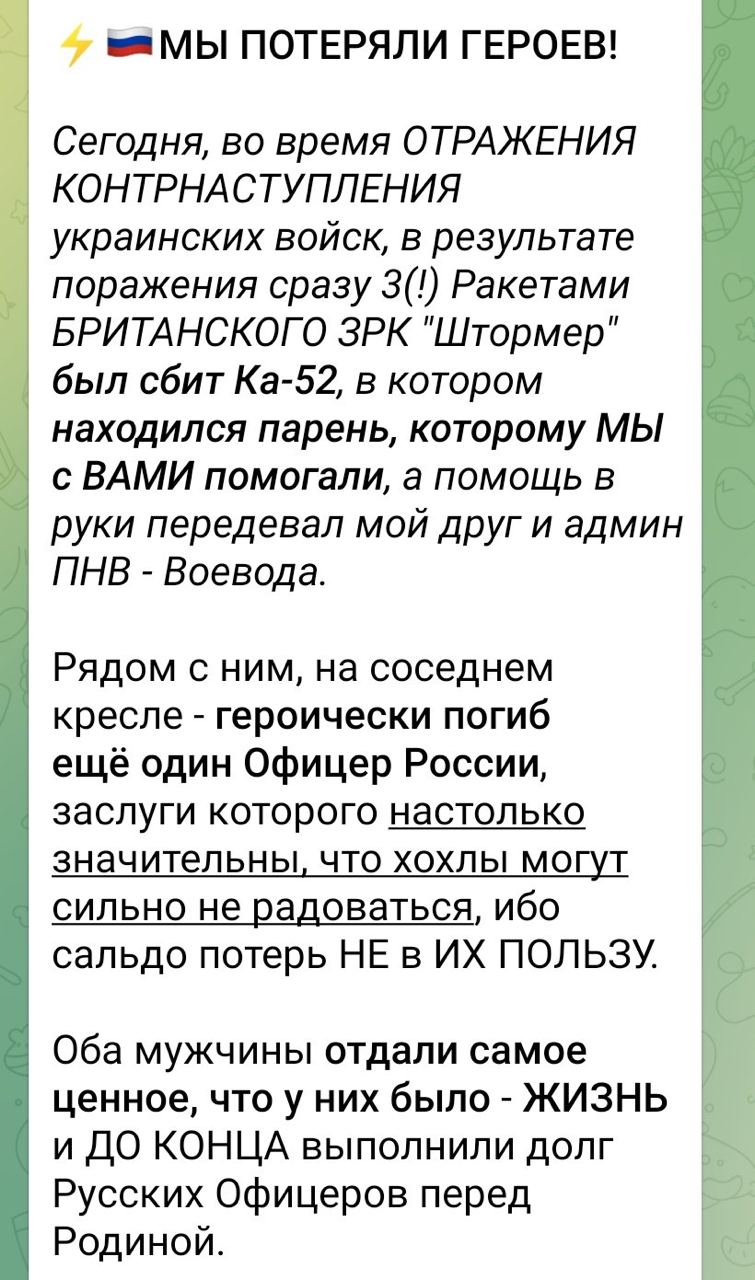 Как написали российские СМИ, украинские военные сбили вертолет Ка-52 тремя ракетами британского ЗРК "Штормер". Сообщается, что при отражении контрнаступления Вооруженных сил Украины погиб его экипаж, в том числе, одним из них был офицер.