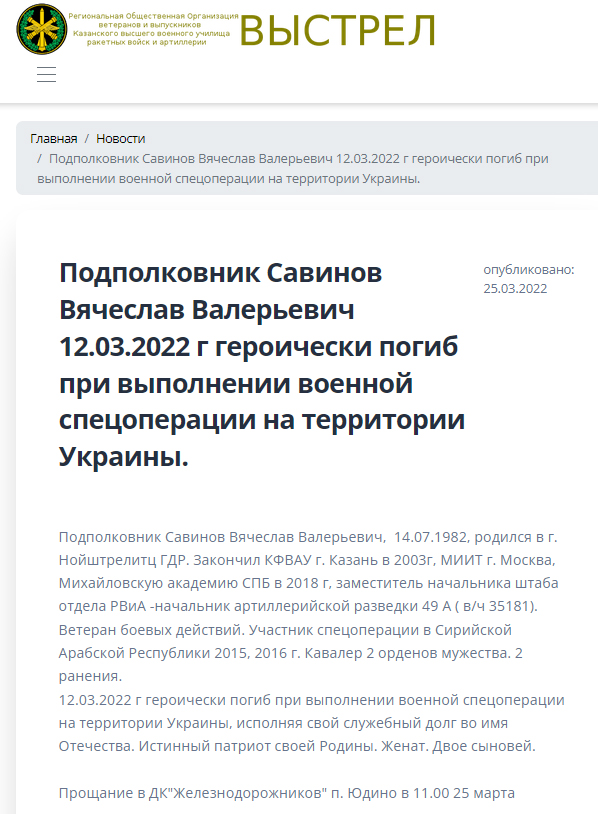 Савинов до Украины успел повоевать в Сирии, имел два ранения и был дважды награжден орденами "За мужество". Он погиб еще 12 марта, но сообщения о его гибели стали появляться в конце марта - начале апреля.
