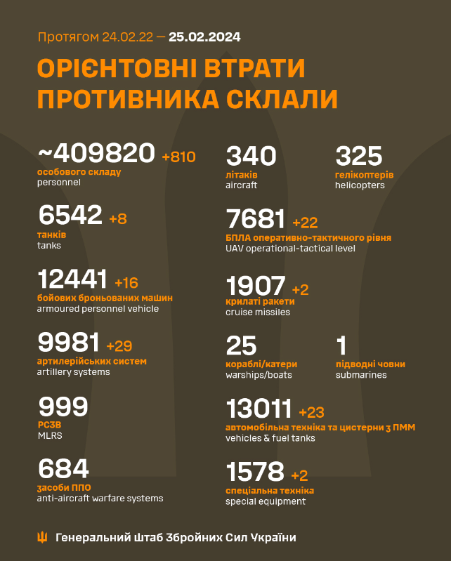 По состоянию на 25 февраля, 732-й день полномасштабного российского вторжения, украинские воины за прошедшие сутки ликвидировали 810 оккупантов и много военной техники противника, в том числе восемь танков, 22 БПЛА и 29 артиллерийских систем.
