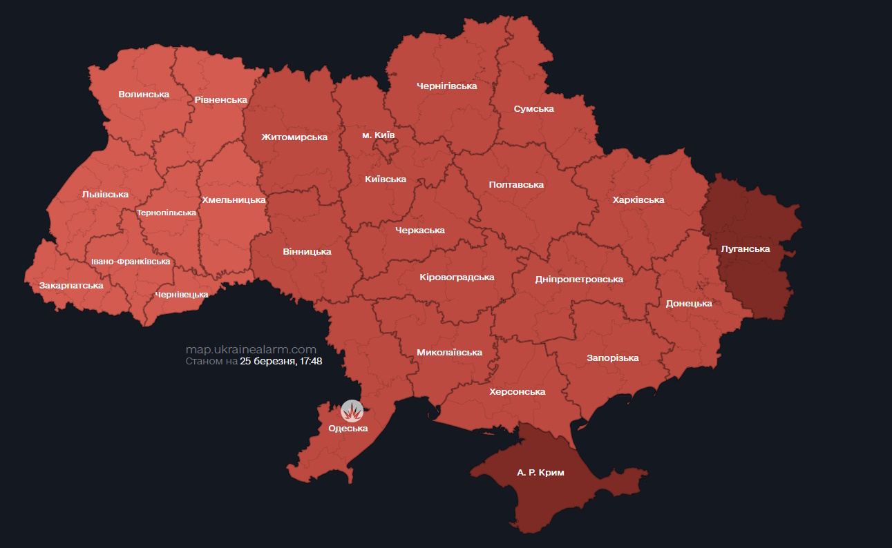 В понедельник, 25 марта, по всей Украине объявили воздушную тревогу, прозвучали взрывы.