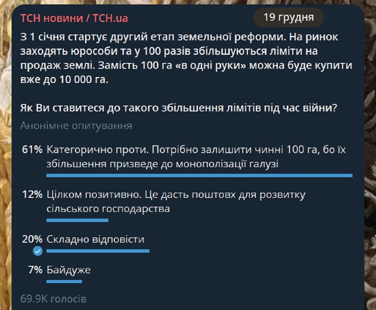 61% украинцев высказались категорически против увеличения лимитов на продажу сельскохозяйственной земли во время войны.