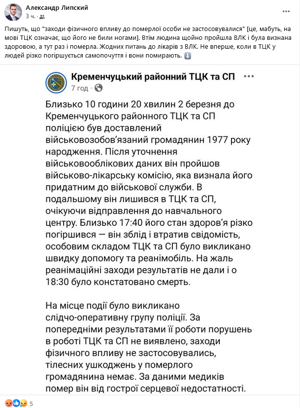 "Пишут, что "меры физического воздействия к умершему лицу не применялись" [это, по-видимому, на языке ТЦК означает, что его не били ногами]. Впрочем, человек только что прошел ВВК и был признан здоровым, а тут раз и умер. Никаких вопросов к врачам по ВВК. Не в первый раз, когда в ТЦК у людей резко ухудшается самочувствие и они умирают", - отметил Липский.