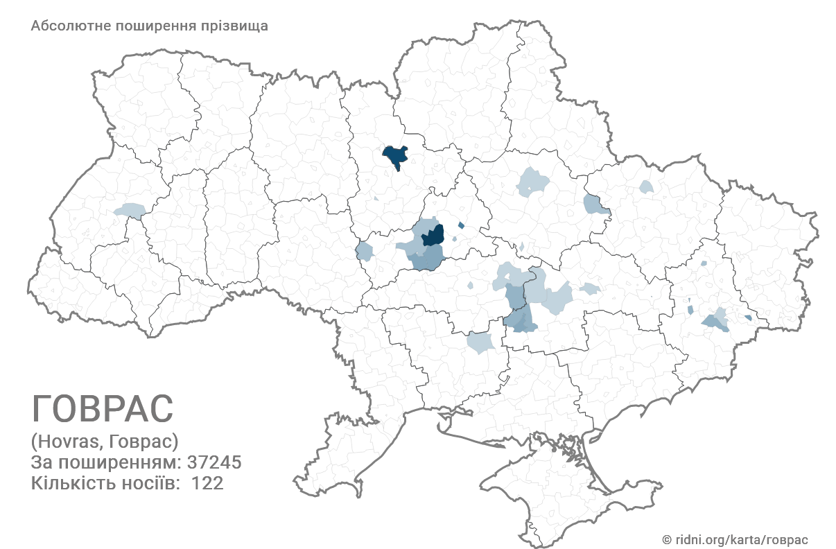 Фамилия Говрас насчитывает 122 носителя. По распространению – на 37245 месте. Можно встретить чаще всего на Приднепровье.