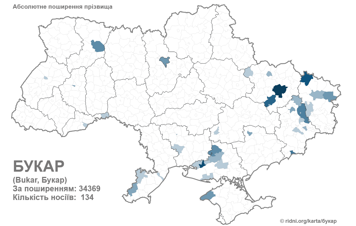 Так, фамилия Букар сейчас имеет 134 носителя, а по распространению занимает 34369 место. Чаще всего можно встретить на Слобожанщине.