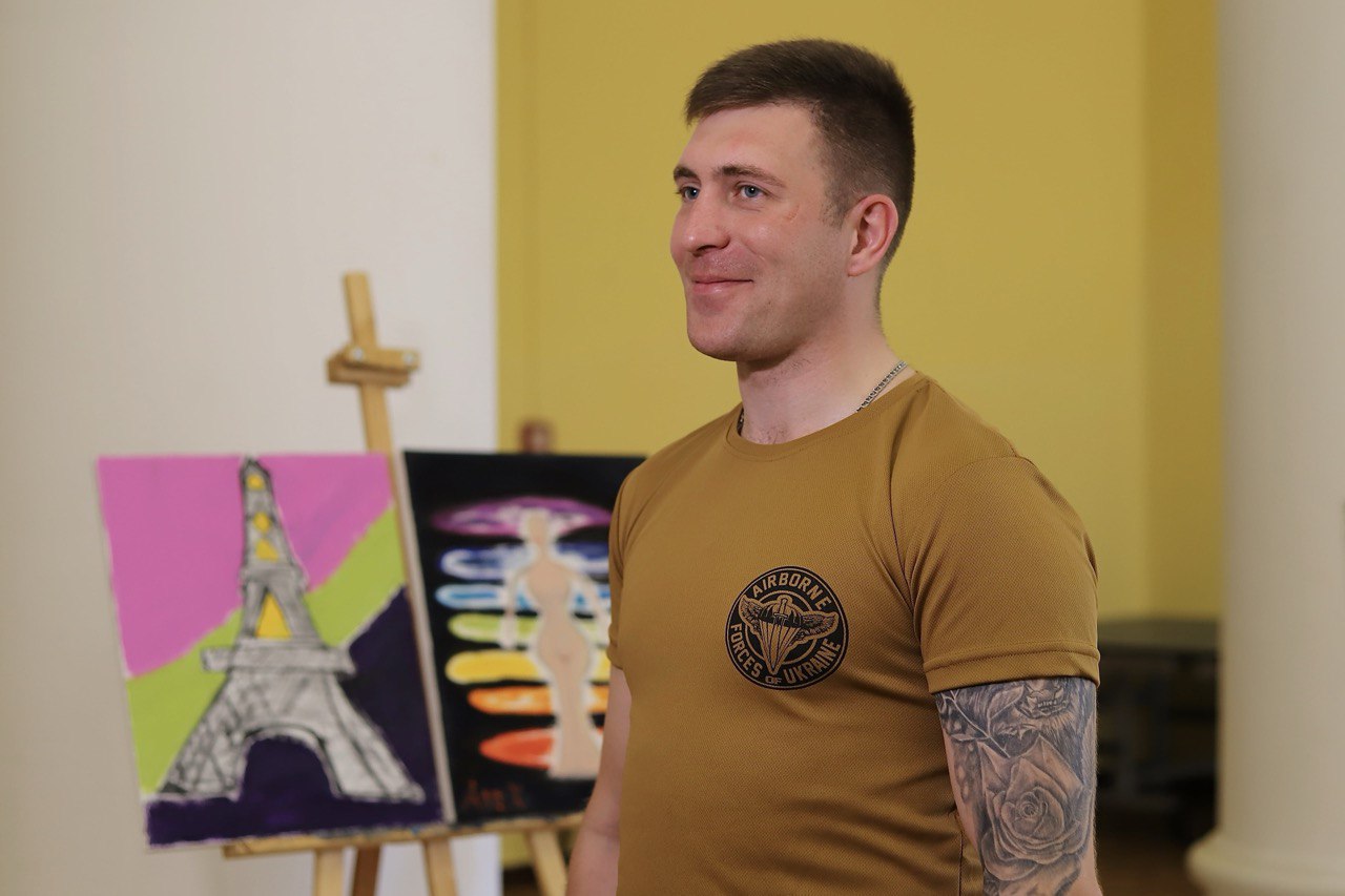 Олег Скрипка, командир стартового взвода ПВО, который до войны был предпринимателем из Киева, нарисовал улыбку. 37-летний Дмитрий Ничволод, офицер пунктов управления, представил на выставке образ золотой рыбки. До войны работал дизайнером и увлекался альпинизмом. Александр Куколенко, 47 лет, старший стрелок-оператор, до войны был сценаристом актером театра и кино, создал образ кита в океане. Всего на выставке представлены картины 11 ветеранов российско-украинской войны. Все авторы – добровольцы.