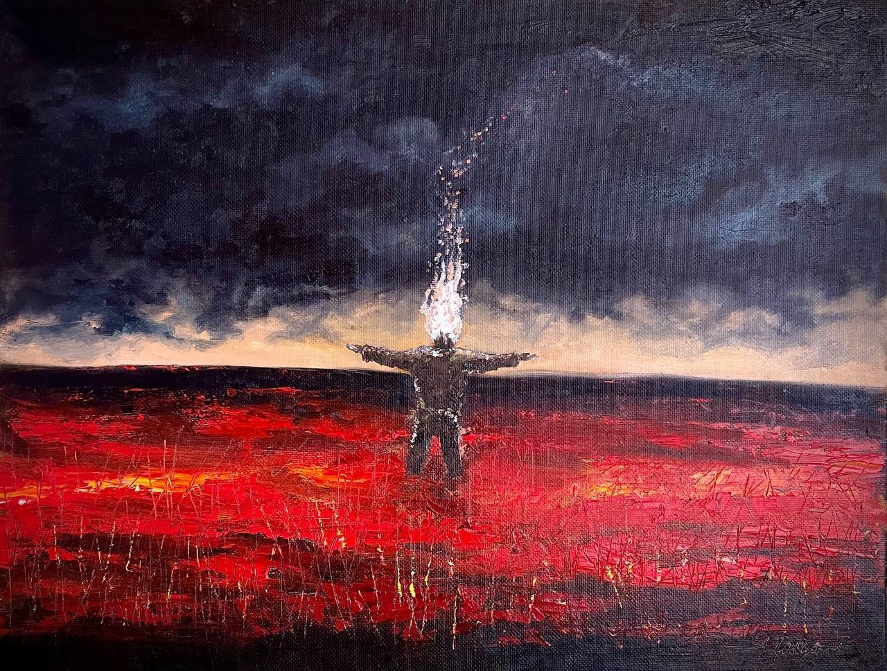 На рисунках Андрея Донецкого – 47-летнего наводчика противотанкового отделения роты огневой поддержки, – много войны: силуэт смерти; кровавый отпечаток ладони на броне с белым крестом; колючая проволока; воин, склонивший голову на фоне горящего от взрыва неба; солдат на красном поле, от которого поднимается к небу душа. До войны Андрей был оценщиком в Краматорске.