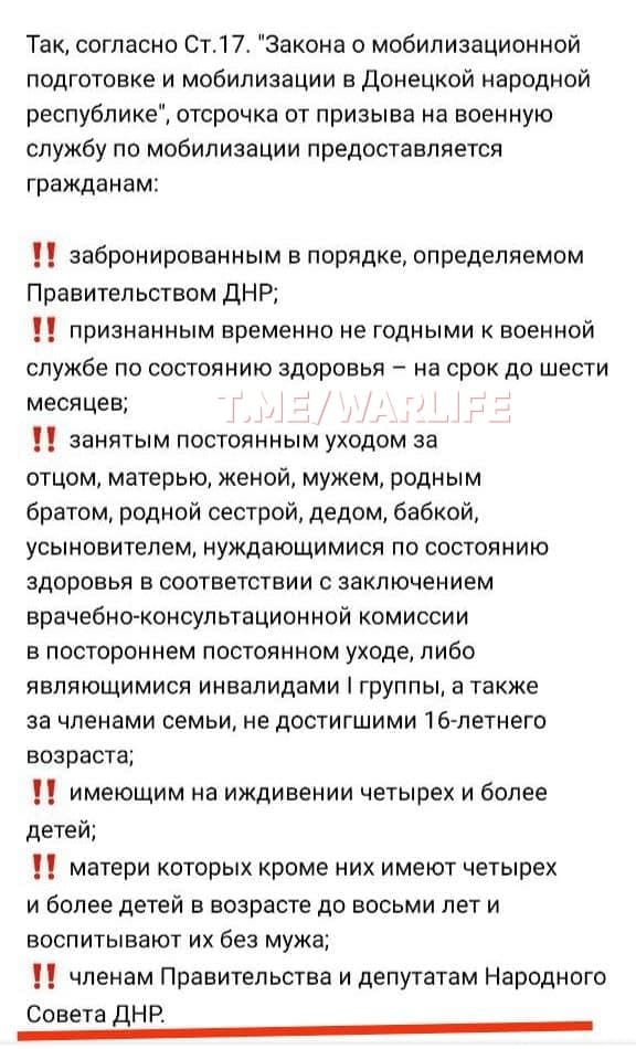 В то же время, согласно т.н. "закона ДНР" "О мобилизации", не подлежат призыву в ряды незаконных вооруженных формирований: