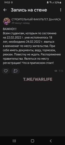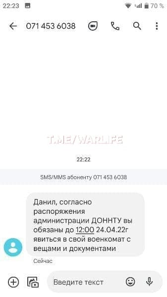 Оккупационные силы призывают студентов на "службу" в т.н. "армию ДНР". Некоторым студентам на телефоны приходят сообщения с требованием явиться на "призывной пункт" с документами, бельем, сухим пайком на несколько дней и водой. При этом отмечается, что "повестки" ждать не нужно.