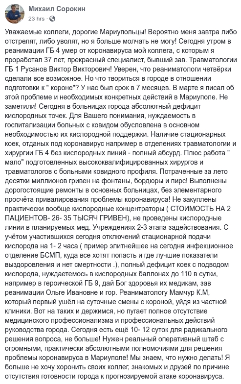 "Сегодня есть еще 10-12 суток для радикального решения вопроса, не больше! Нужен реальный оперативный штаб с огромными, практически абсолютными полномочиями для решения проблемы коронавируса в Мариуполе! ... Я больше не хочу хоронить своих коллег, знакомых и друзей по причине отсутствия готовности города к прогнозируемой атаке коронавируса", - резюмировал Сорокин.