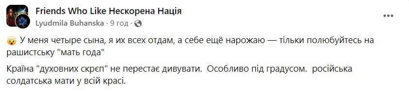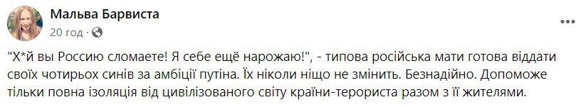 Украинцы с юмором отреагировали на подобное признание "Z-патриотки" и отметили, что "скрепная страна" не прекращает удивлять. Пользователи возмутились, что женщине не жалко отправить своих всех сыновей на фронт ради того, чтобы они погибли за амбиции Владимира Путина.