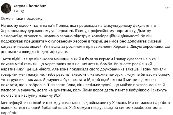 "На этом видео - тетя по имени Полина, работавшая на физкультурном факультете в Херсонском государственном университете. Ее сыну, профессиональному тюремщику, Дмитрию Чемерисину, объявили недавно заочно подозрение в коллаборационной деятельности, потому что он продолжал работать в оккупированном Херсоне в тюрьме, где, вероятно, помогал системе пытать наших людей. Сбежал вслед за россиянами при освобождении Херсона. Спасибо херсонцам, что помогли быстро их идентифицировать", - написала Чорногуз.