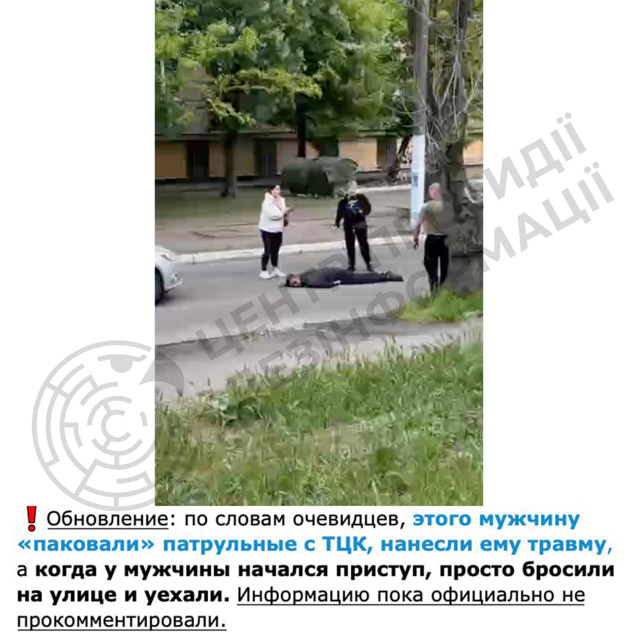 В частности специалисты ЦПИ говорят, что авторы этого сообщения утверждают, что мужчину избили якобы работники патрульной полиции и ТЦК и СП.