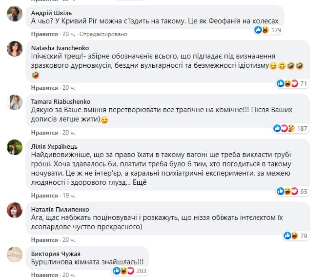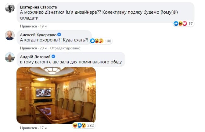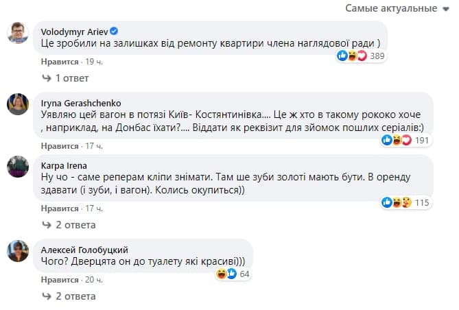 "Янтарная комната нашлась!", "Представляю этот вагон в поезде Киев-Константиновка .... Это же кто в таком рококо хочет, например, на Донбасс ехать? .... Отдать как реквизит для съемок пошлых сериалов", "Ага, сейчас набегут ценители и расскажут, что нельзя обижать интеллектом их леопардове чувство прекрасного", - пишут комментаторы.